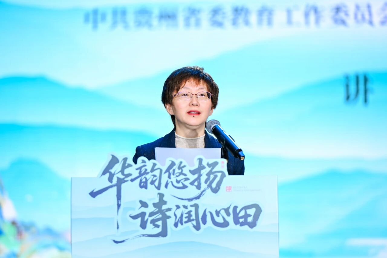 江山代表省教育厅发言,她指出,“中华诗词,是刻在中华民族血脉里的精神标识,也是语言文字魅力的集中体现。贵州首届诗词大会的举办,不仅是一场文化赛事,更是一场推广普及国家通用语言文字、激活传统经典生命力的重要行动。”她介绍,近年来,省教育厅通过举办中华经典诵写讲大赛、开展中小学教师经典诵读专项培训、推进“典耀中华”主题读书行动,持续为文化传承注入“教育力量”,让中华优秀传统文化在年轻一代中扎根生长。