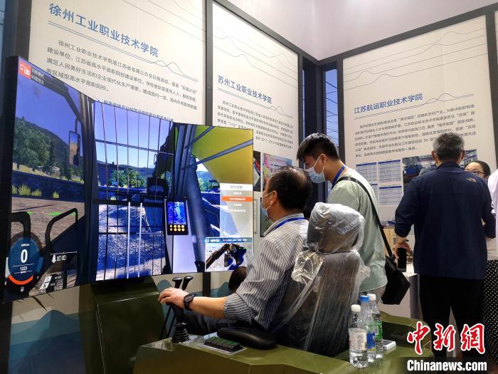 图中,参展民众正在模拟驾驶挖掘机。 沙见龙 摄