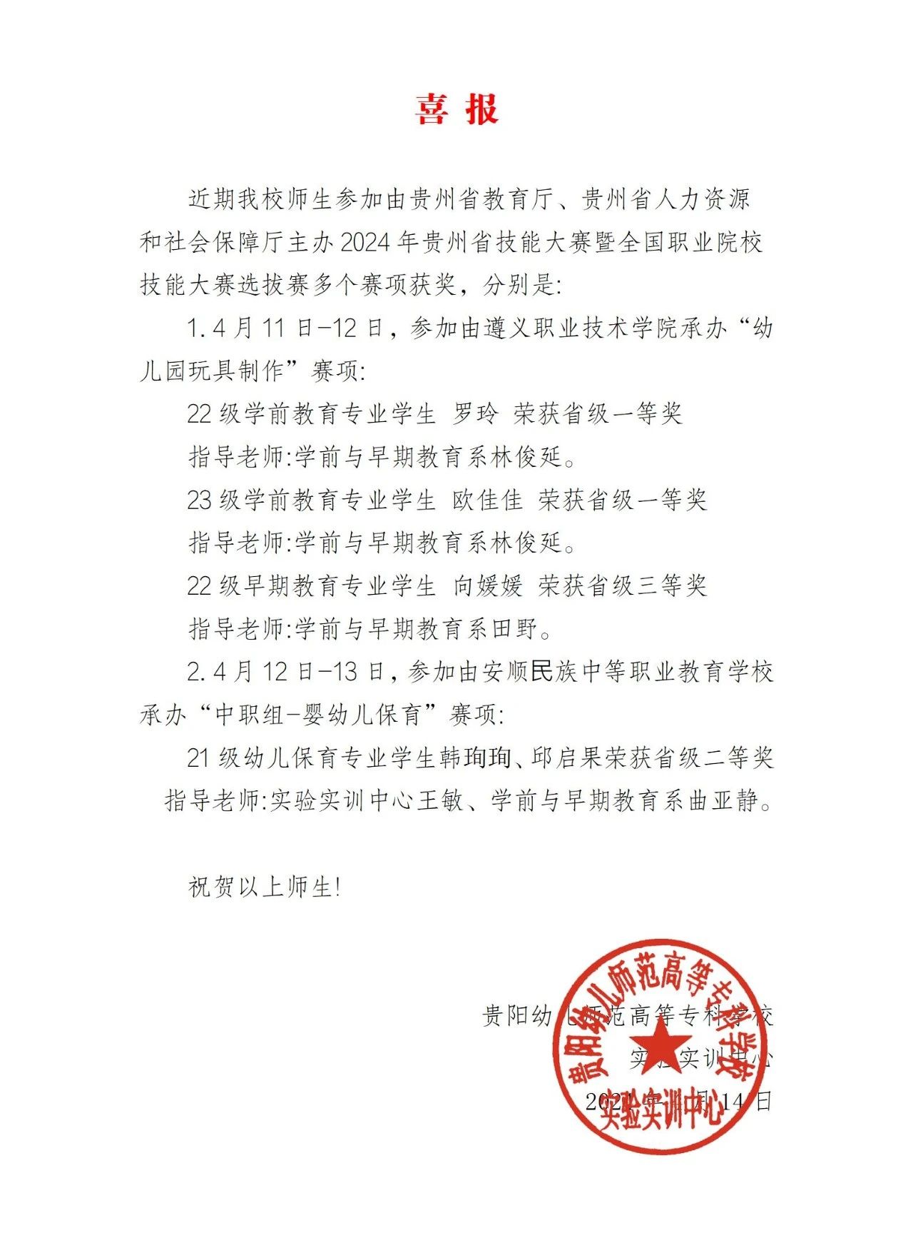 近期Beat365师生参加由贵州省教育厅、贵州省人力资源和社会保障厅主办的2024年贵州省职业院校技能大赛暨全国职业院校技能大赛选拔赛多个赛项获奖,分别是: