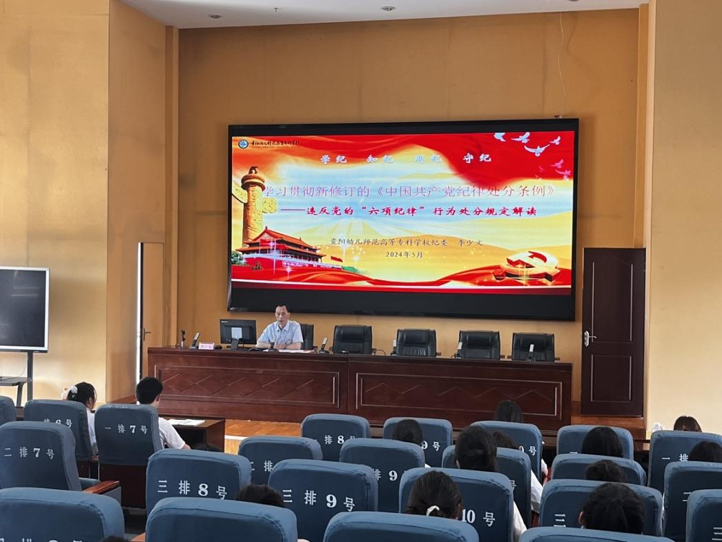 校纪委副书记李少文讲授了“学习贯彻新修订的《中国共产党纪律处分条例》——违反党的‘六项纪律’行为处分规定解读”,从违反党的政治纪律、组织纪律、廉洁纪律、群众纪律、工作纪律、生活纪律六个方面进行导读和讲解。