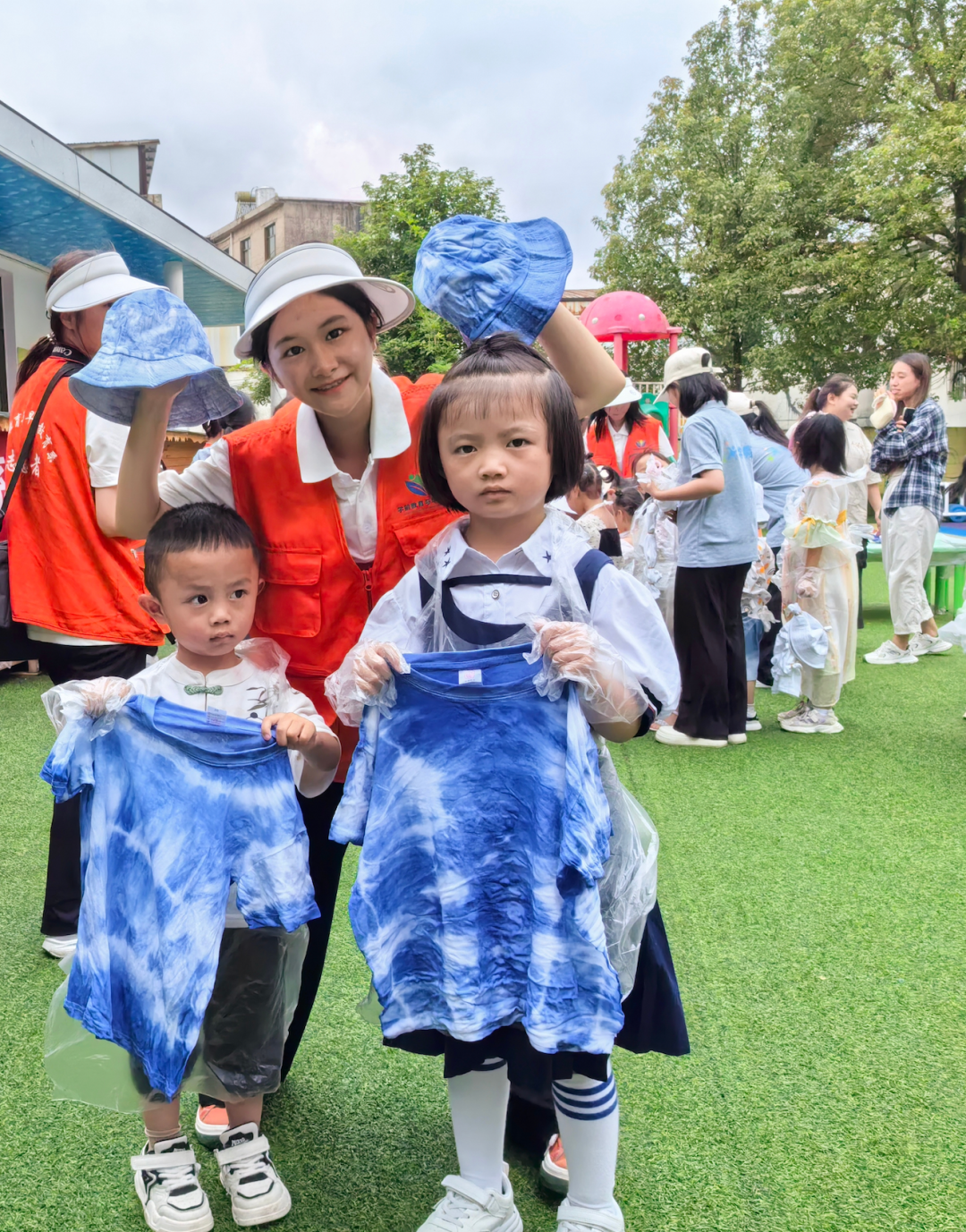 在贝益智幼儿园,队员们为当地儿童介绍扎染的知识与方法,并指导他们亲自动手尝试扎结、染色,创造出属于自己的扎染作品。