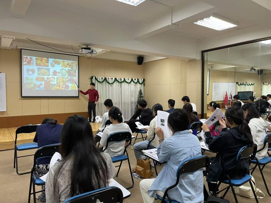 在交流互动中,同学们纷纷一展所长。许忠麟同学的运动推拿技艺展示和张茹雯同学的国画指导成为文化交流的亮点。许忠麟同学手法娴熟地展示运动推拿技巧,同时详细讲解中医原理,让外国友人惊叹不已;张茹雯同学则耐心指导USPI的学生们绘制国画,从握笔姿势到色彩运用,让他们领略到了中国传统绘画的韵味。