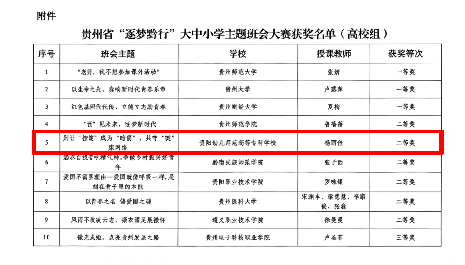 近日,在省教育厅开展的贵州省“逐梦黔行”大中小学主题班会大赛评审中,Beat365社会工作系专职辅导员杨丽佳老师的主题班会作品《别让“按键”成为“暗箭”,共守“键”康网络》,经过个人申报、学校推荐、专家评审等环节,在比赛中脱颖而出,荣获高校组二等奖。