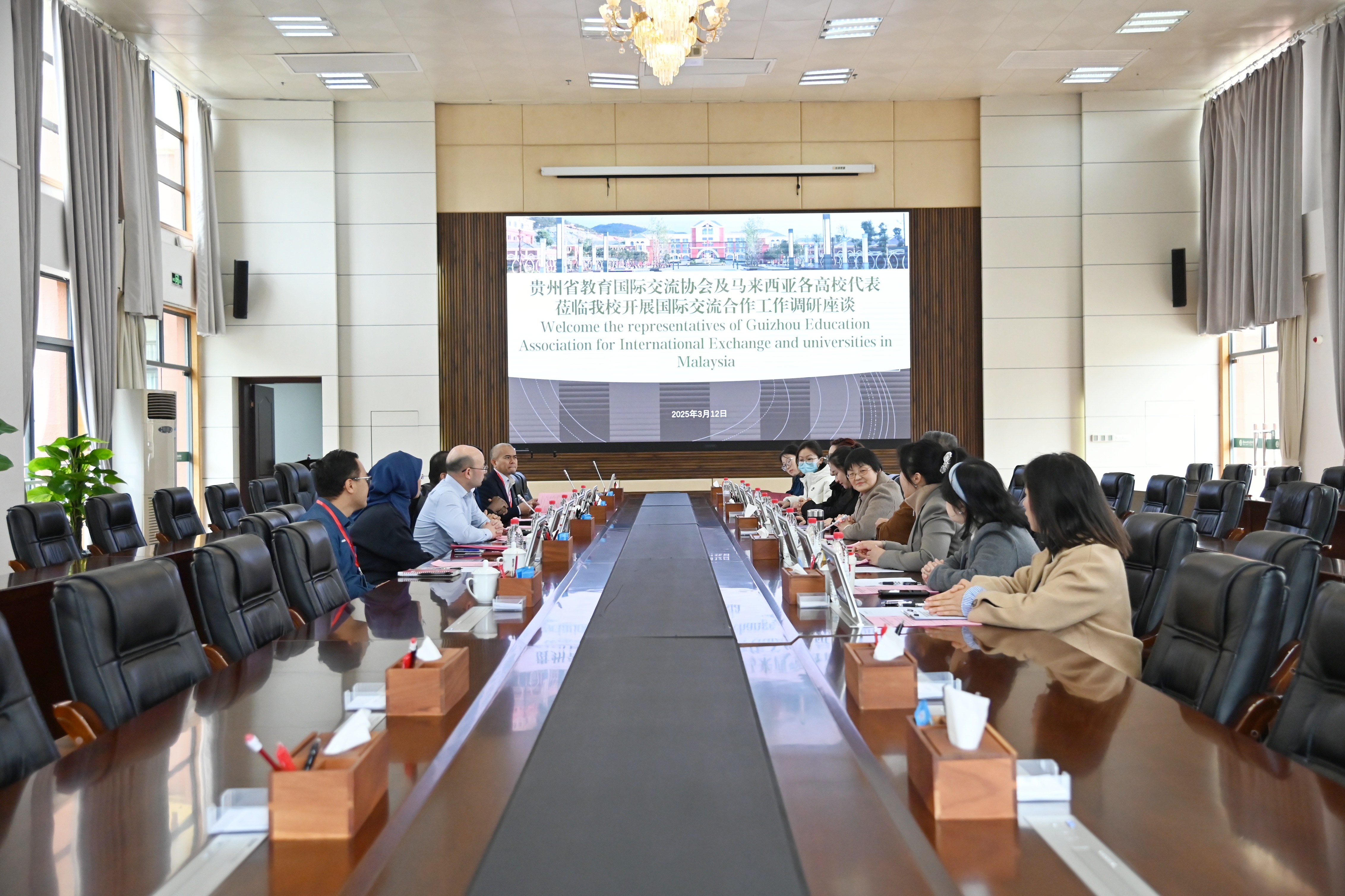 3月12日,贵州省国际教育交流协会秘书长陈小飞及马来西亚高校代表一行到Beat365开展国际交流合作走访调研。Beat365党委委员、副校长潘丽芬出席调研会,基础教学部负责人及相关工作人员参加。近年来,为响应“一带一路”教育合作倡议,深化中马高等教育合作,马来西亚多所高校积极寻求国际化合作,对中国高校的学科建设、科研实力及人才培养模式表现出浓厚兴趣。