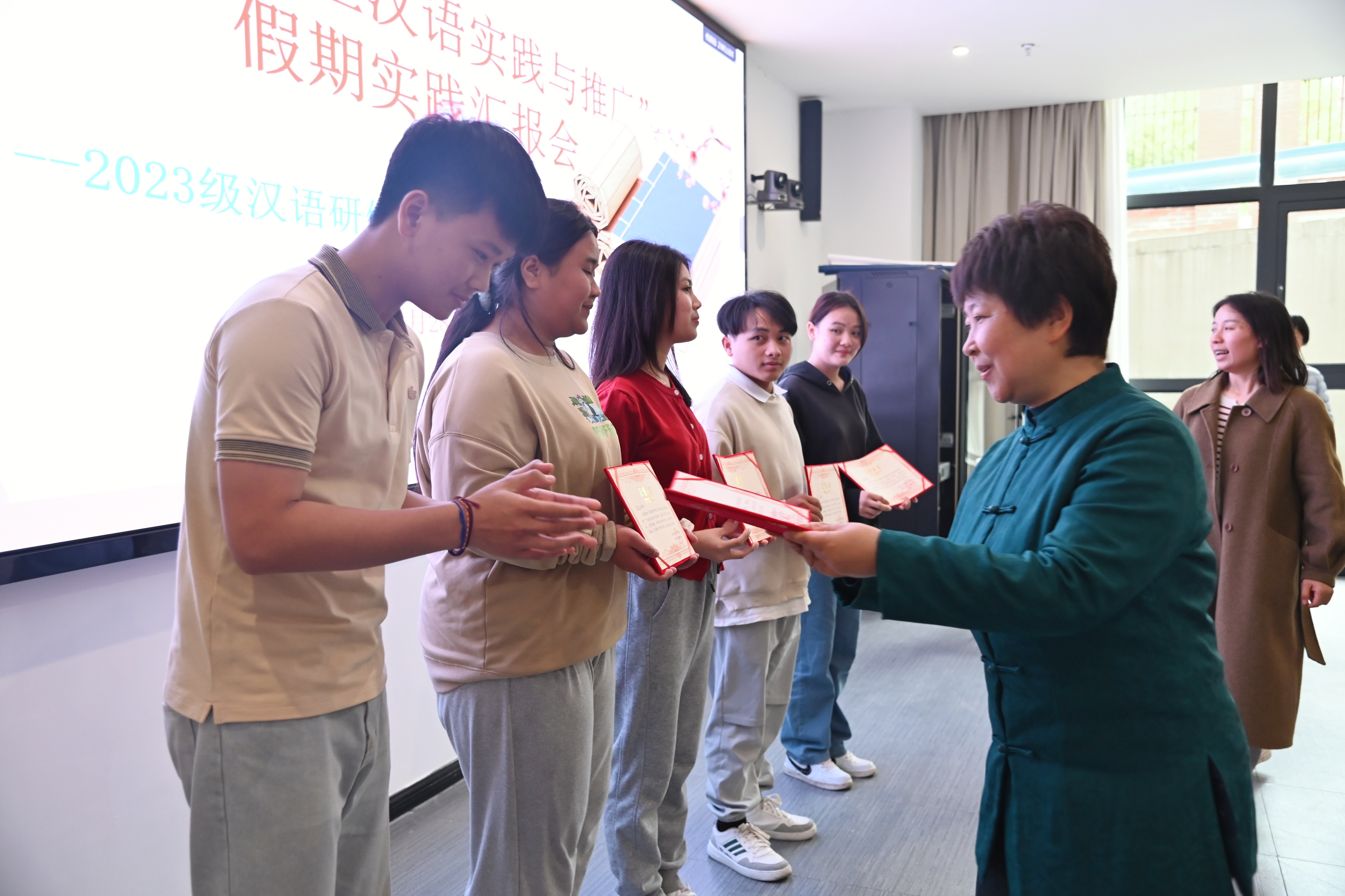 翟理红在总结讲话中,结合汇报内容,向留学生提出四点希望:一是以文化共情促文明互鉴。“从乌多姆赛到贵阳:中老文化的多维思考调研证明,差异之下自有共鸣。同学们要以文化为媒,架设民心相通之桥。”二是以语言之力筑合作之基。“中文能力是个人发展的阶梯,更是国家合作的战略资源。要用好这把‘金钥匙’,服务母国与中国的共同发展。”三是以全面发展报桑梓之情。“建设家乡需复合型人才。既要深扎专业领域,又要汲取中华智慧,方能成为祖国建设的擎天柱。”四是以双梦交融书时代答卷。“国际学生个人的‘祖国梦’与‘中国梦’血脉相连。当你们带着中华文化滋养回国时,要成为友谊的信使、合作的纽带,书写文明交融的时代篇章!”潘丽芬主持颁奖仪式,为表现优异的学生颁发荣誉证书。她勉励同学们:这份荣誉既是对实践成果的肯定,更是文化传播使命的重托。愿大家在文明交融之路上行稳致远。
