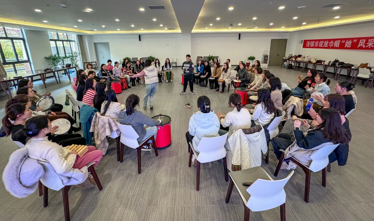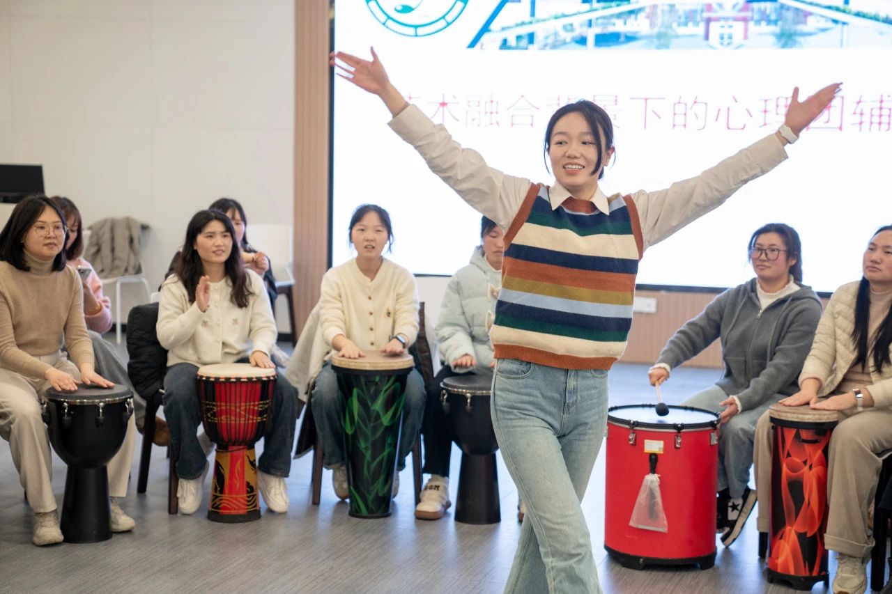 活动突破传统心理辅导模式,创新引入“鼓圈”艺术互动形式。在戴媛媛教授团队的指导下,教师们围坐成圈,手持非洲鼓、金杯鼓、雨声筒等十余种乐器,通过即兴节奏创作实现情感共鸣。随着鼓点从零散到和谐,现场氛围逐渐升温,欢笑声与律动交织,压力在节奏碰撞中悄然释放。“鼓声是心跳的延伸,当个体节奏融入集体韵律,便是团队凝聚力最生动的体现。”戴媛媛教授表示,艺术融合的形式能有效激活教师的情绪表达,为其提供非语言沟通的情感出口。