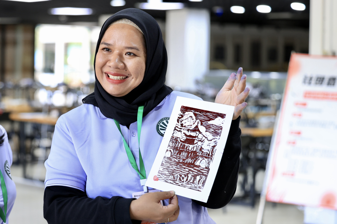 学校基础教学部副主任文佳结合图文与实物展示,向东盟师生介绍贵州美食,解析每道美食背后的地域密码与人文故事。嘉宾们还在工作人员的指导下,于扇面上题写唐诗、绘花鸟,切身参与“诗意解暑——手作扇面体验”活动。穿上汉服,漫步校园,在亲身体验中感受交领右衽、宽袍大袖的形制之美,让“传统服饰”从抽象概念变为可触可感的文化载体。以建筑、河流等为元素体验版画创作,通过细心雕琢,耐心印刷,在指尖感受中华传统文化的博大精深。这场以“小切口”推动文化传播的交流活动,让中国文化从符号化为可触摸的实践——酸汤里的因地制宜、笔墨间的诗意传承、衣冠中的礼仪内涵,版画中的制版印刷,均成为促进民心相通的纽带和桥梁。